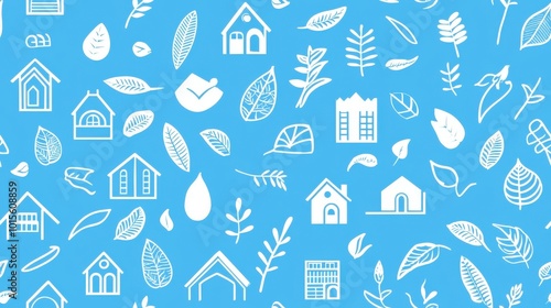Fototapeta premium Traditional Indian houses and dense foliage forming a flowing intricate line art pattern on a light blue background
