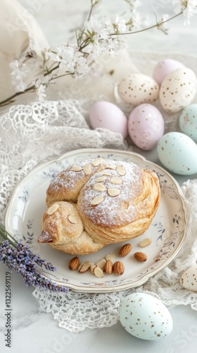 © Studium L&M, Fototapeta premium Traditional Italian Colomba di Pasqua with pastel eggs and almonds, perfect for Easter celebrations