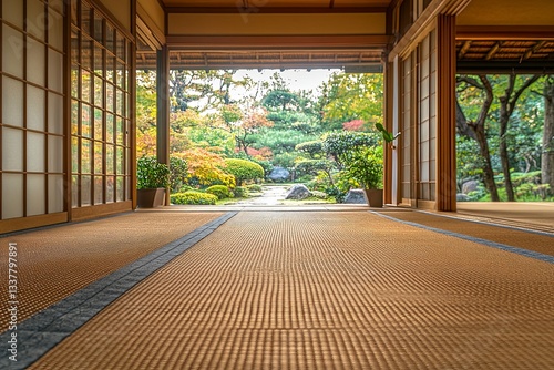 © Creative, Obraz premium Traditional Japanese home interior looking out to serene outdoor garden