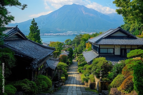 Naklejka premium Traditional japanese houses leading to mount fuji and lake kawaguchiko