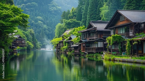Fototapeta premium Traditional Japanese Houses on a Calm River Surrounded by Lush Greenery