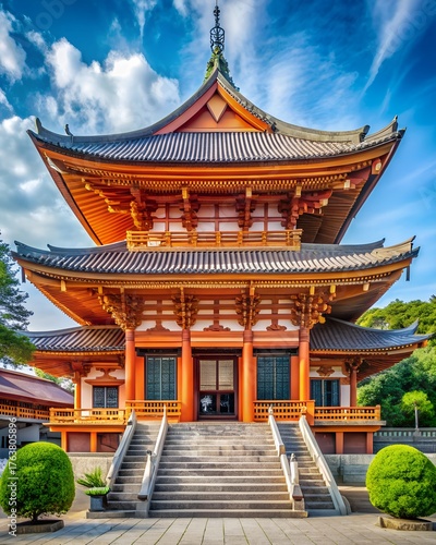 © SYEDARASHEKA, Fototapeta premium Traditional japanese pagoda with intricate details against a blue sky
