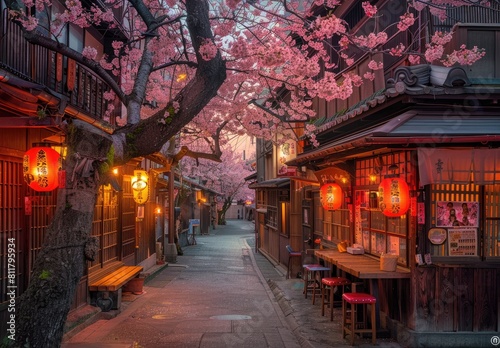 Fototapeta premium Traditional Japanese street, architecture, minimal, stunning cherry blossoms,...