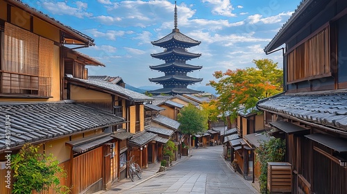Naklejka premium Traditional Japanese Street with Pagoda in the Background