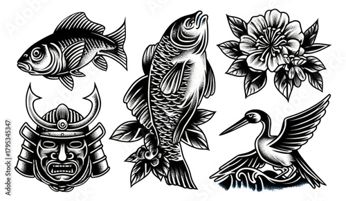 © Putra, Obraz premium Traditional Japanese Tattoo Designs Featuring Fish, Flowers, and Samurai Elements