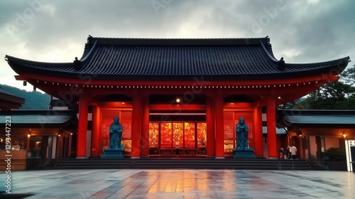 © Professional Agency, Fototapeta premium Traditional japanese temple illuminated at dusk with statues guarding entrance