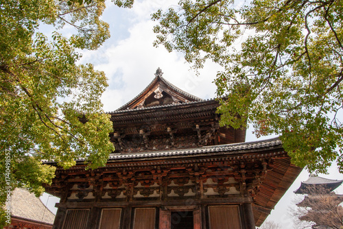 Fototapeta premium Traditional Japanese Temple Surrounded by Lush Greenery