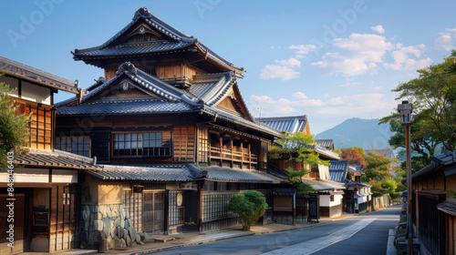 Naklejka premium Traditional Japanese wooden houses on a quiet street, showcasing classic...