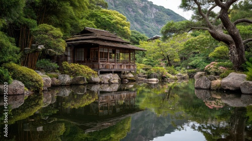 © Svitlana, Fototapeta premium Traditional Japanese wooden teahouse surrounded by a bamboo garden