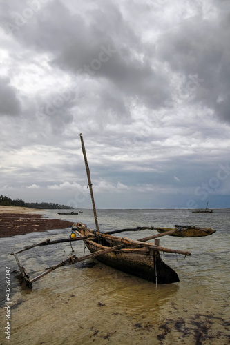 Fototapeta premium Traditional kenyan fishing boat in Indian ocean on the background of dramatic cloudy skyt. Surroundings of Mombasa, Kenya.