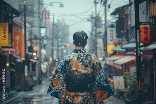 © Valentin, Fototapeta premium Traditional Kimono in a Rainy Japanese Street