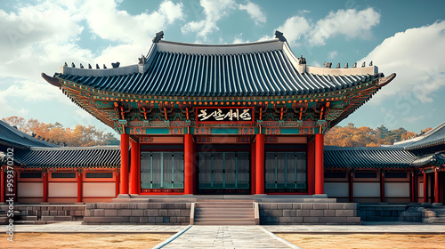 © Siasart Studio, Fototapeta premium Traditional Korean Architecture with a Red Roof and Stone Steps.