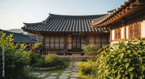 Obraz premium Traditional Korean courtyard, sunlight on wooden houses and a garden path