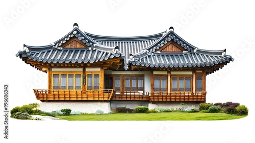 © Pumapala, Obraz premium Traditional Korean Hanok House with Curved Roof and Wooden Structure