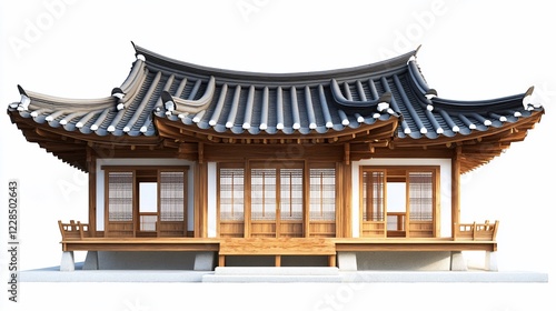 © Amien19, Obraz premium Traditional Korean Hanok House with Gray Tiled Roof and Wooden Structure