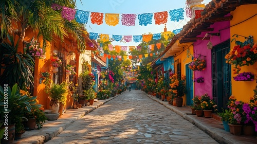 © Warakorn, Fototapeta premium Traditional Latin American street with hanging flags bright colors cultural celebration art