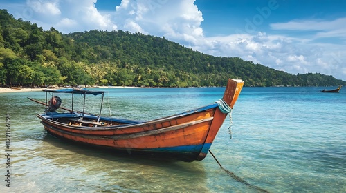 Fototapeta premium Traditional Longtail Boat Anchored by Tropical Beach with Blue Waters :...