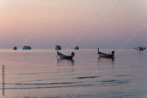 Naklejka premium Traditional Longtail Boat at Sunset in Koh Tao Thailand