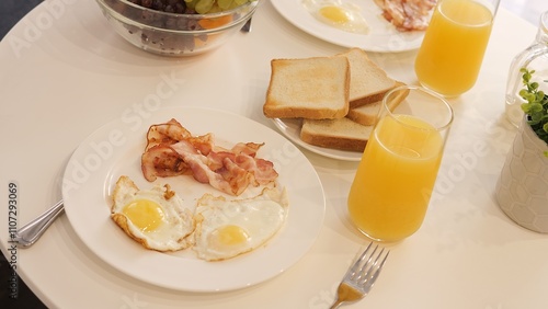 Fototapeta premium Traditional morning breakfast with bacon and eggs is served at table Egg yolks glisten adding an attractive touch to hearty breakfast Perfect combination of bacon and eggs for cozy morning atmosphere