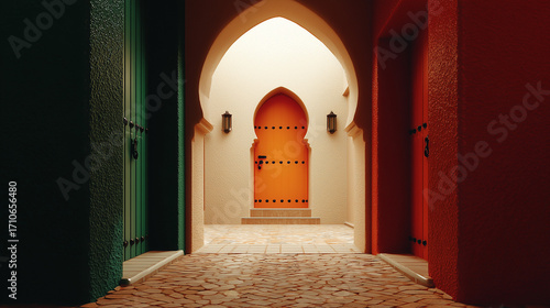 © Moustafa, Fototapeta premium Traditional Moroccan alley with colorful tiled archways and bright doors