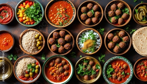 Fototapeta premium Traditional Moroccan Kefta Bowls with Fresh Toppings and Flavorful Sides for...