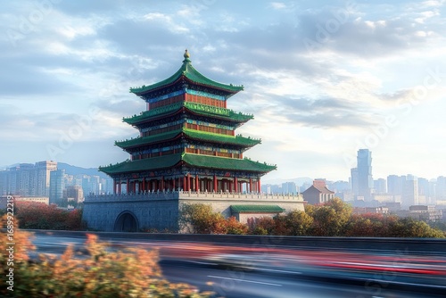 Fototapeta premium Traditional multi-tiered pagoda with green tiled roofs and red pillars standing beside a busy highway with blurred car lights against a city skyline and cloudy sky during daytime