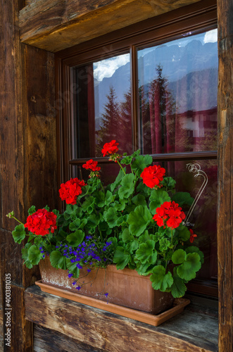 © MoVia1, Fototapeta premium Traditional ornamented window in Selva village, Gardena valley, Dolomites, South Tirol, Italy.