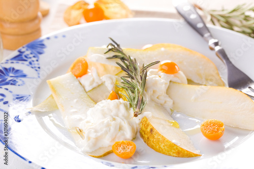 © Artem Kudryavtsev, Fototapeta premium traditional pear and cheese salad on a white plate
