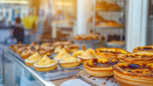 © mirifadapt, Fototapeta premium Traditional portuguese dessert. Bakery shop window display.