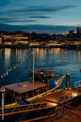 © Cavan, Fototapeta premium Traditional Rabelo boat docked on the Douro River at blue hour, Porto