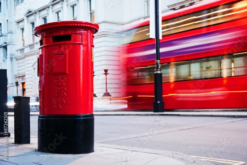 © Photocreo Bednarek, Fototapeta premium Traditional red mail letter box and red bus in motion in London, the UK.