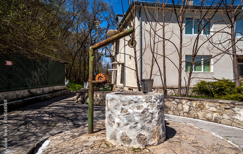Fototapeta premium Traditional Romanian fountain with water bucket at St Andrew's Monastery ,Romania