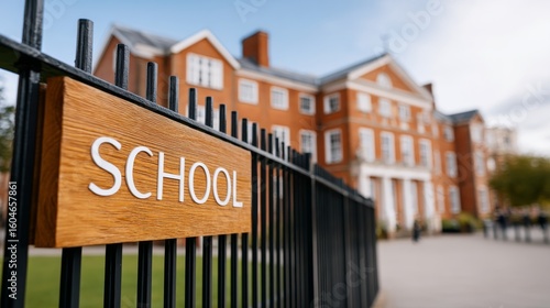 © Nana, Obraz premium Traditional School Building with Wooden School Sign Surrounded by Greenery