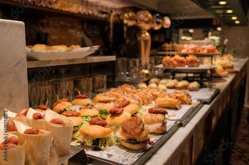 © Olga, Obraz premium Traditional spanish snacks, appetizers or tapas called pintxos in a bar counter in San Sebastian, Basque country, Spain. Typical Basque cuisine in a typical cafe or restaurant or tapas bar.