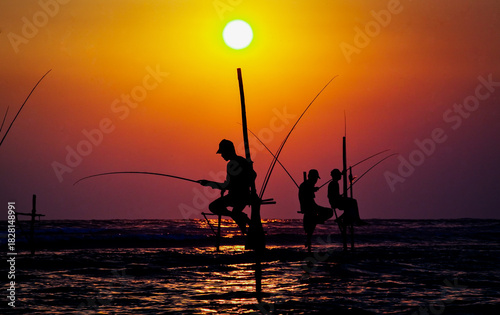 © Melinda Nagy, Fototapeta premium traditional stilt fishermen of sri Lanka fishing at sunset
