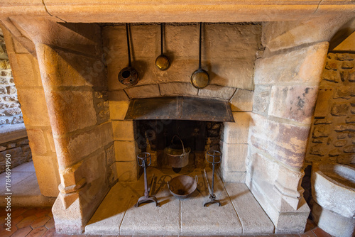 Fototapeta premium Traditional stone fireplace with cooking utensils in Couches, FRANCE