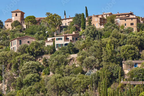 © h368k742, Obraz premium Traditional stone houses and tramuntana mountain range in Deia. Balearic