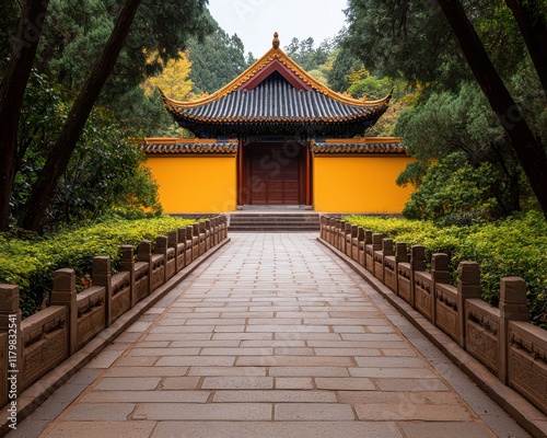 Fototapeta premium Traditional Stone Pathway Leading to Serene Chinese Structure
