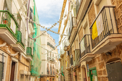© Ulysses, Fototapeta premium Traditional stone residential building with green balconies and palms in Cadiz, Andalusia, Spain, September 2025.