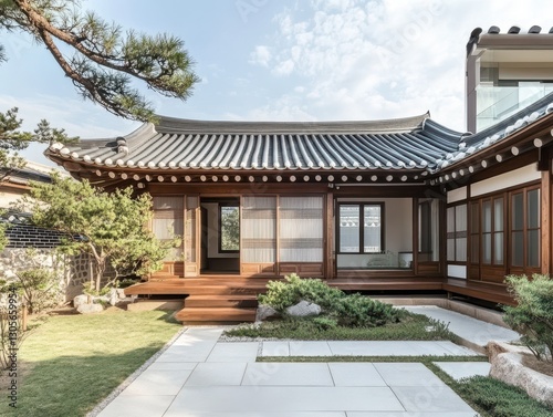 © RaksaLinggo, Fototapeta premium Traditional style wooden house with beautiful landscaping and surrounding greenery