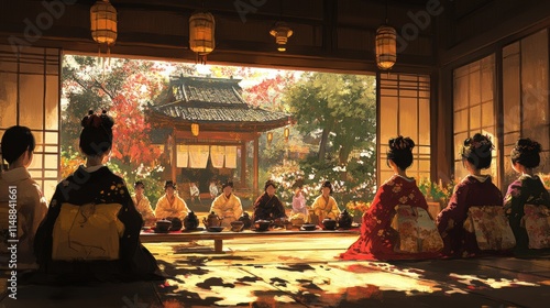 Fototapeta premium Traditional tea ceremony scene with kakemono displayed in the background, enhancing the ambiance.