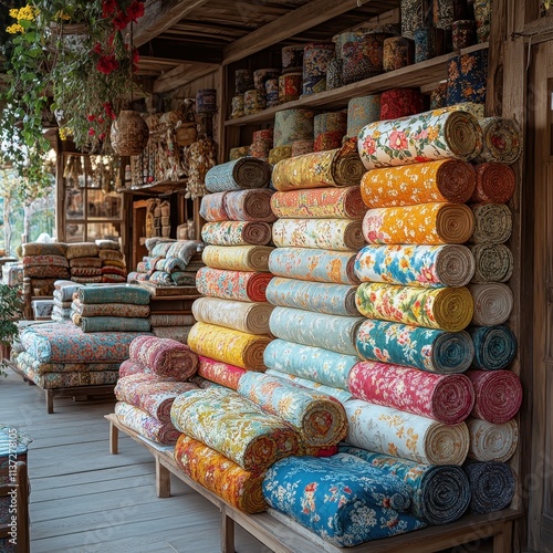 Fototapeta premium Traditional textile shop with colorful patterns and fabric on display