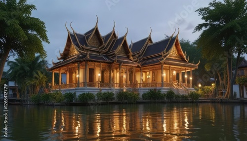 © Sathaporn Buarabut, Fototapeta premium Traditional Thai architecture along the Chao Phraya riverbanks, buildings, architecture