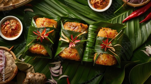 Fototapeta premium Traditional Thai banana leaf-wrapped parcels filled with fragrant rice and curry