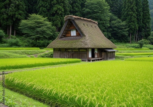 © Shaki, Obraz premium Traditional thatched-roof house nestled within lush green rice fields.