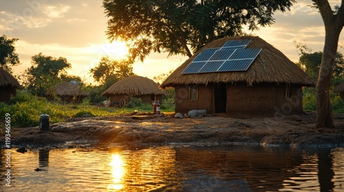 © izzuddin, Fototapeta premium Traditional Thatched Roof Houses with Solar Panels Against a Golden Sunset in an African Rural Landscape Reflected on Calm Water
