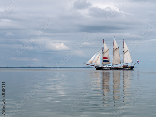 Obraz premium Traditional three-mast clipper sailing on IJsselmeer lake, Netherlands
