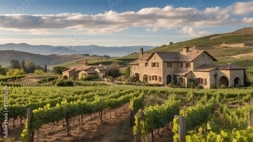 Naklejka premium Traditional vineyard estate with stone buildings, rolling hills, and rows of...
