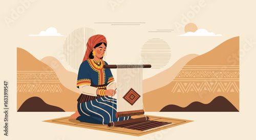 Obraz premium Traditional Weaver Creates Handmade Carpet in Desert Backdrop Illustration