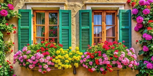 Fototapeta premium Traditional window shutters adorned with vibrant blooming flowers